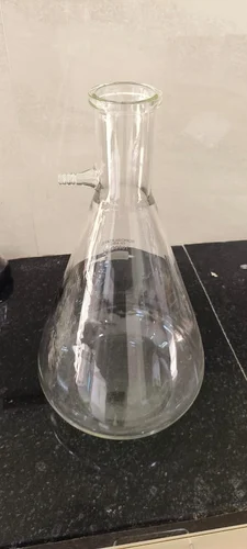 The conical shape of the flask not only provides stability during use but also minimizes spillage and splashing, making it ideal for use with vacuum filtration setups. The wide base and tapered neck allow for easy swirling and mixing of contents without risk of overflow. The design includes a side arm or outlet, which is typically used to connect the flask to a vacuum source, enabling efficient filtration by creating a pressure differential. This setup significantly speeds up the filtration process, particularly when working with fine particulate matter or high-viscosity fluids, ensuring faster and more efficient results in a laboratory setting.
