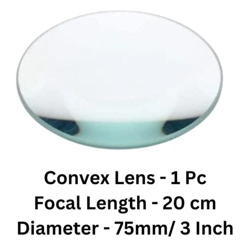 The glass convex lens with a 75 mm diameter and a focal length of 20 cm is an essential optical component widely used in educational, scientific, and experimental environments. Carefully crafted from high-quality optical glass, this convex lens demonstrates excellent clarity, precision curvature, and superior light transmission. Its spherical outwardly curved surface allows it to converge parallel rays of light to a single focal point, making it an ideal instrument for demonstrating and understanding fundamental optical principles such as refraction, convergence, focal length, magnification, and image formation.
