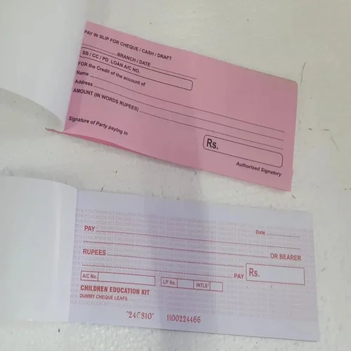 A dummy cheque book with pay-in slips is primarily an educational tool used in schools/labs to teach banking concepts, allowing students to practice filling out realistic cheques and deposit slips for handling money, understanding account details (date, name, amount), and learning secure banking procedures without real money. It simulates real banking, helping students with financial literacy, account management, and practicing transactions before doing them in a real bank.