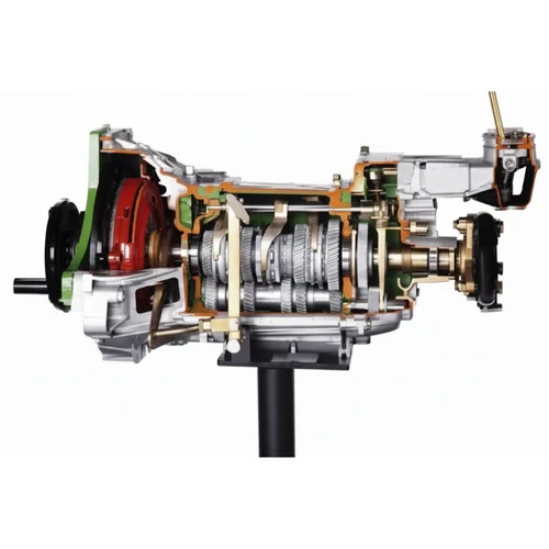 This full-size gearbox model is prepared from original parts and mounted on a sturdy stand, enabling students to engage with gear shifting mechanisms, speed ratios, and power transmission. The detailed design assists in technical understanding of automotive gear systems vital for mechanical engineering and vocational training.