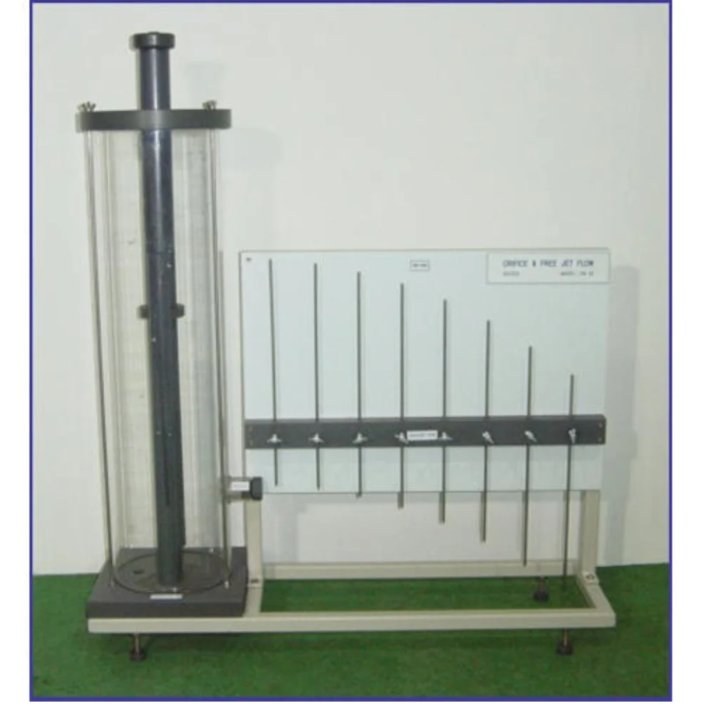 The orifice and jet velocity apparatus is a practical fluid mechanics teaching system designed to study water discharge and jet behavior under controlled conditions. It uses a transparent Plexiglas column with an adjustable overflow to regulate water level and flow rate accurately. Because visual observation improves learning, the clear column allows students to see flow patterns directly. Moreover, the closed water circulation system ensures stable operation without the need for an external water supply. As a result, the apparatus supports repeatable experiments in academic laboratories.