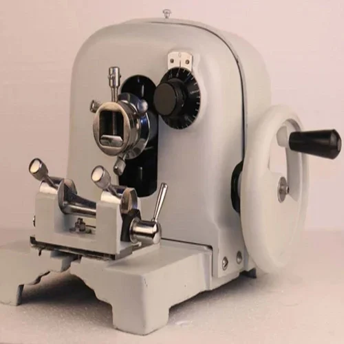 An Erma Type Rotary Microtome is a precise, manual instrument used primarily in histology, pathology, and research labs to slice biological tissues (like biopsies) and other materials (like leather, textiles) into extremely thin, uniform sections (often 1 micron) for microscopic analysis, ensuring stability with a heavy base and fine control via a hand-cranked rotary mechanism for diagnostic and educational purposes.